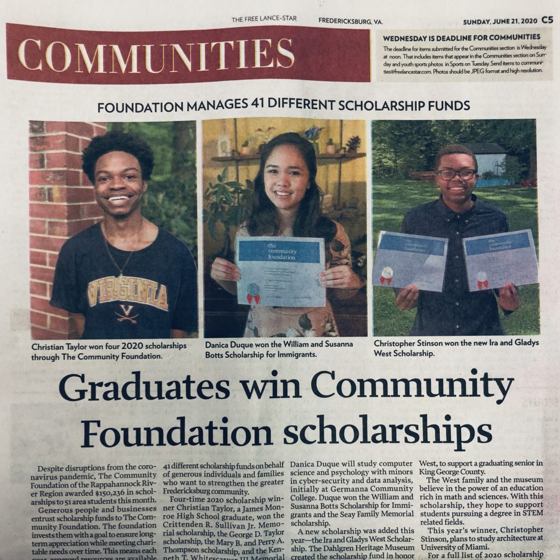 he Community Foundation of the Rappahannock River Region awarded $150,236 in scholarships to 51 area students this month.